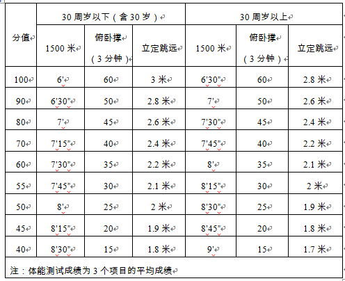 (2)體能測(cè)試滿分100分,達(dá)到60分合格,不滿60分取消資格。得分按比例折算入總成績(jī)。