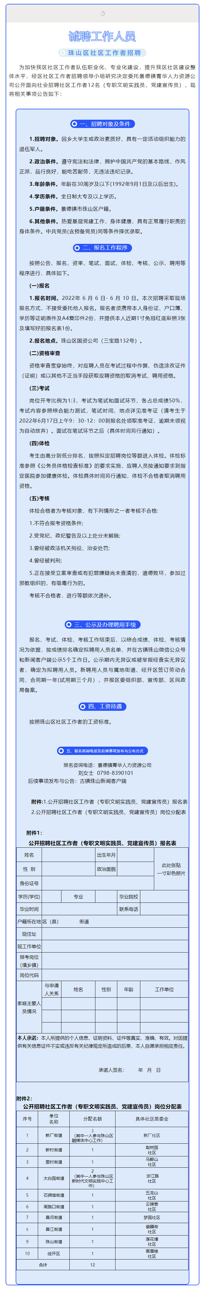 2022-06-04 00:34:06閱讀()景德鎮(zhèn)市珠山區(qū)人民政府為加快我區(qū)社區(qū)工作者隊伍職業(yè)化、專業(yè)化建設(shè),提升我區(qū)社區(qū)建設(shè)整體水平,經(jīng)區(qū)社區(qū)工作者招聘領(lǐng)導(dǎo)小組研究決定委托景德鎮(zhèn)菁華人力資源公司公開面向社會招聘社區(qū)工作者12名(專職文明實踐員、黨建宣傳員),現(xiàn)將相關(guān)事項公告如下: