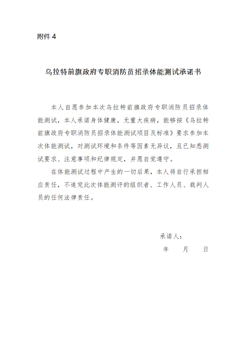 4.《烏拉特前旗政府專職消防員招錄體能測(cè)試承諾書》;