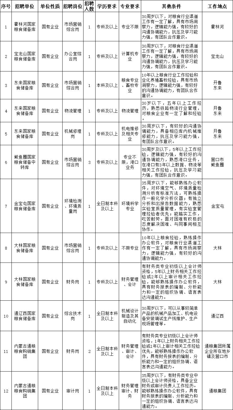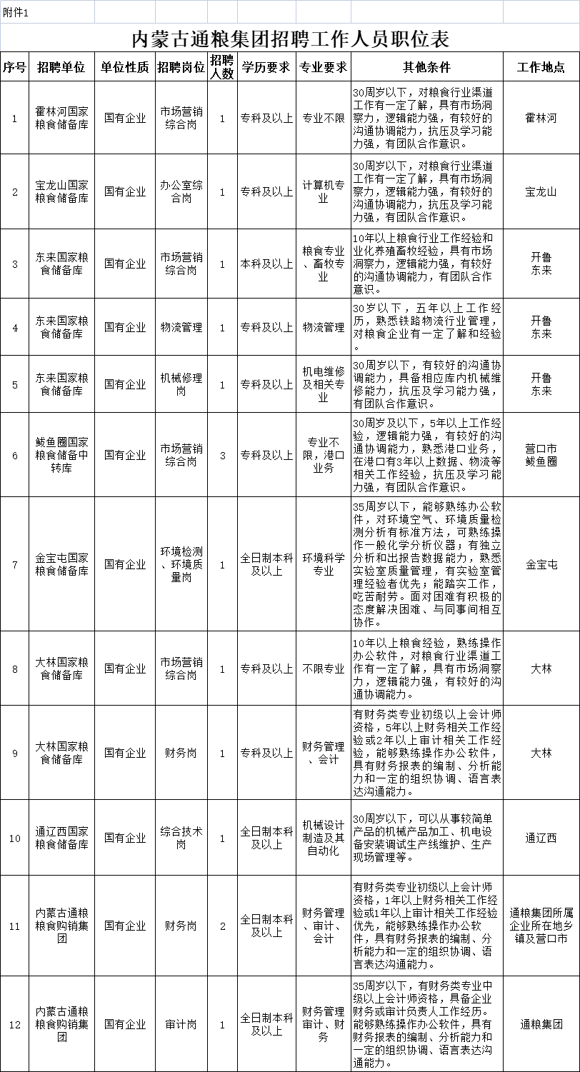 內(nèi)蒙古通糧集團招聘工作人員職位表