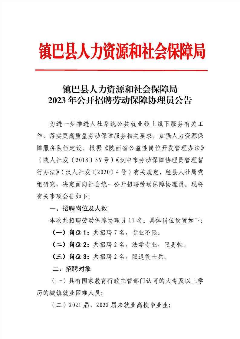 2023年漢中鎮(zhèn)巴縣人力資源和社會(huì)保障局公開招聘勞動(dòng)保障協(xié)理員公告