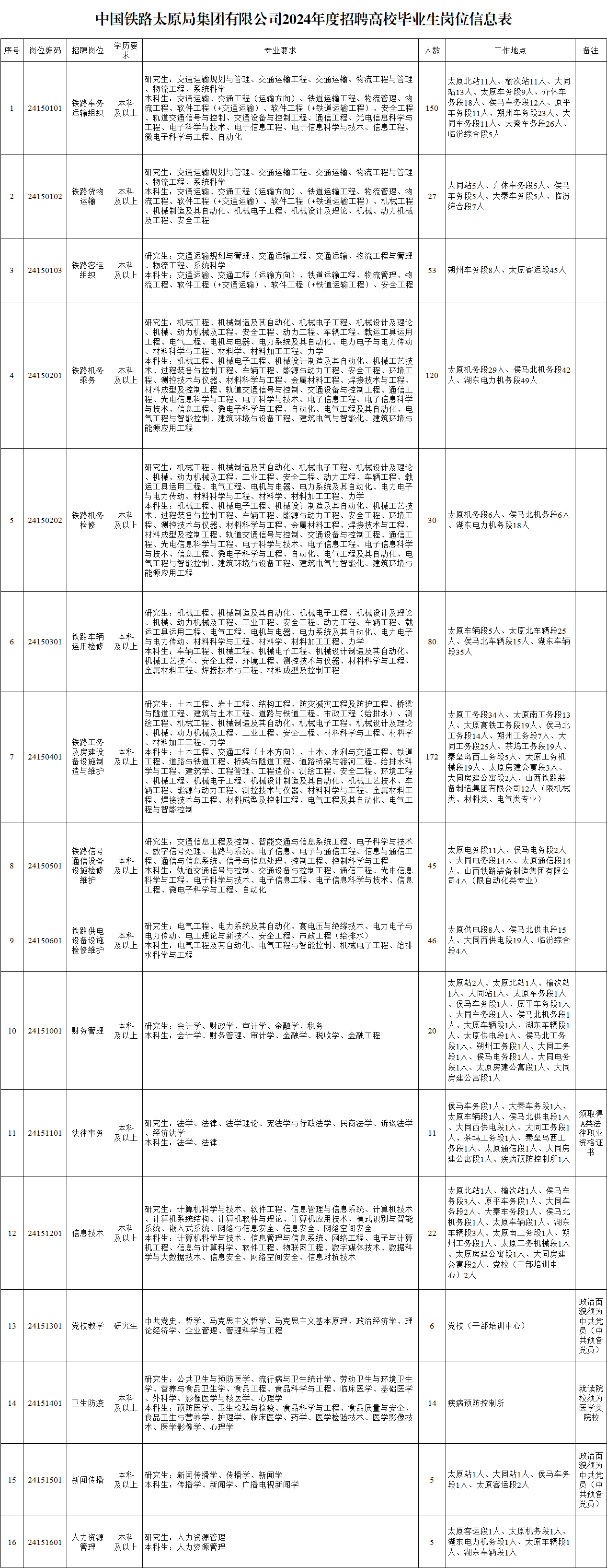2023-11-28 21:23:08閱讀()中國鐵路太原局集團有限公司根據(jù)企業(yè)發(fā)展需要,現(xiàn)將2024年普通高等院校研究生和全日制本科學(xué)歷畢業(yè)生招聘有關(guān)事項公告如下: