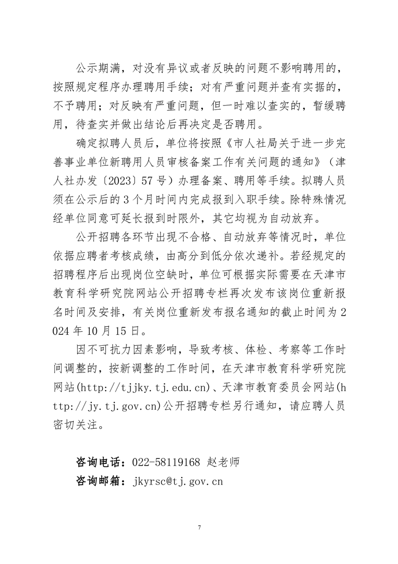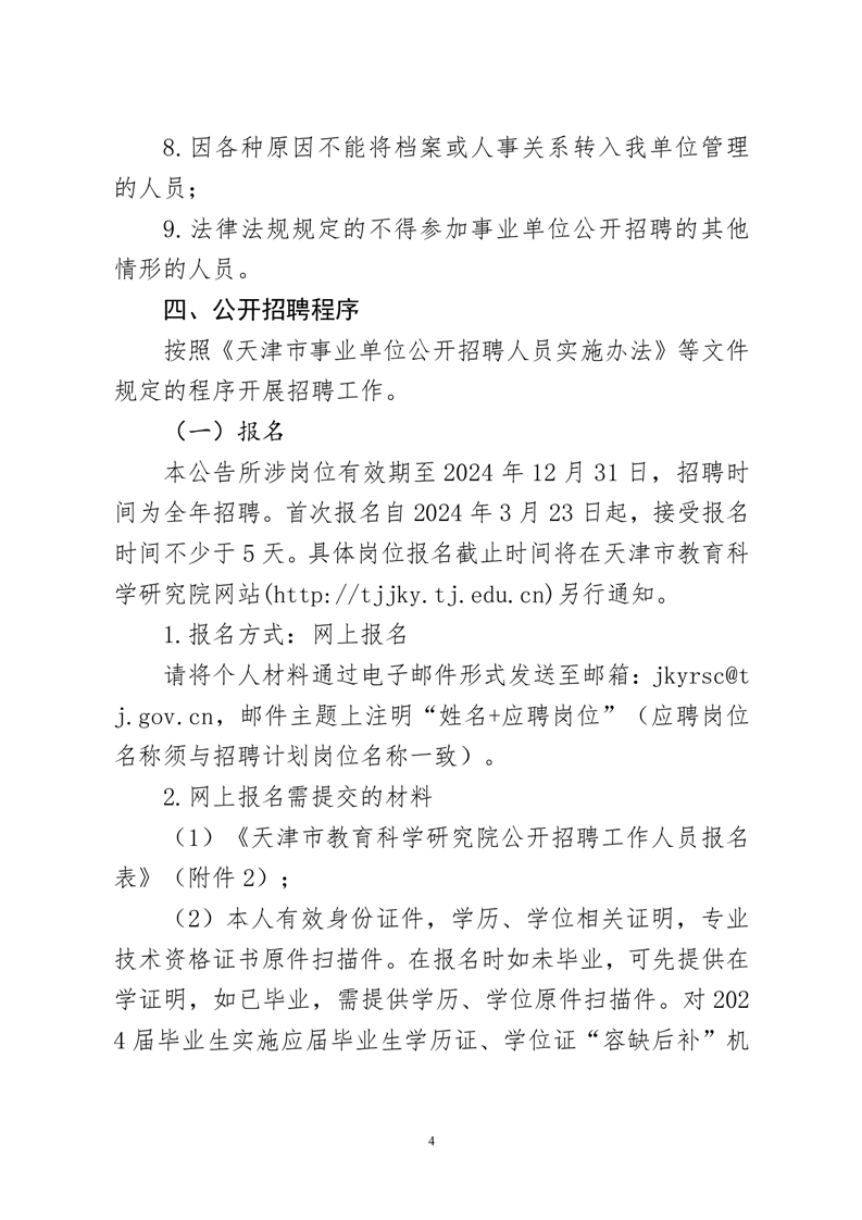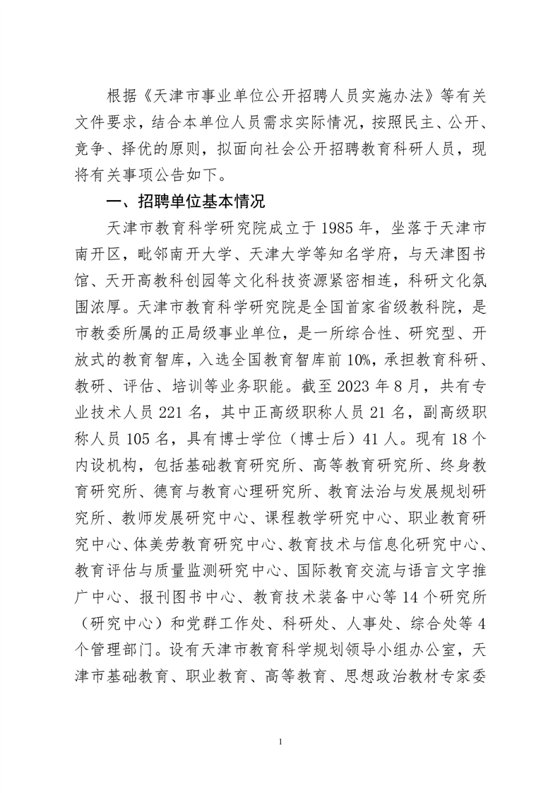 2024-03-22 17:17:37閱讀()天津市教育科學(xué)研究院根據(jù)《天津市事業(yè)單位公開招聘人員實(shí)施辦法》等有關(guān)文件要求,結(jié)合本單位人員需求實(shí)際情況,按照民主、公開、競(jìng)爭(zhēng)、擇優(yōu)的原則,擬面向社會(huì)公開招聘教育科研人員,現(xiàn)將有關(guān)事項(xiàng)公告如下。