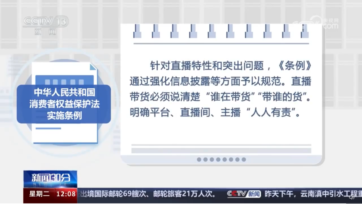 2024-04-09 17:27:03閱讀()市場監(jiān)管總局4月9日消息,《消費(fèi)者權(quán)益保護(hù)法實(shí)施條例》(以下簡稱《條例》)7月1日起正式生效。針對直播帶貨虛假營銷、貨不對板、退換困難等問題:《條例》要求,直播帶貨必須說清楚“誰在帶貨”“帶誰的貨”。明確平臺、直播間、主播“人人有責(zé)”。