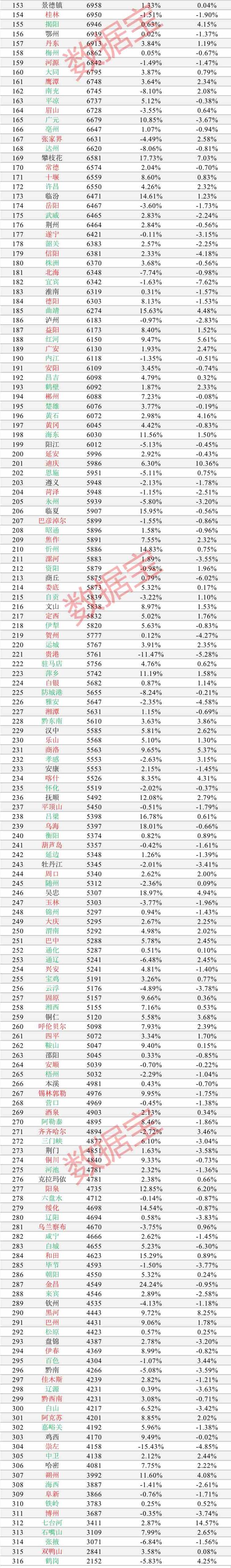 南方城市霸榜高房價榜,北方城市則云集低房價榜。數(shù)據(jù)顯示,東北鶴崗二手房均價僅2152元,位居倒數(shù)第一,并且在2019年下跌的情況下,2020年再度出現(xiàn)下跌,最新均價同比跌5.83%。房價倒數(shù)前十城市全部在北方。