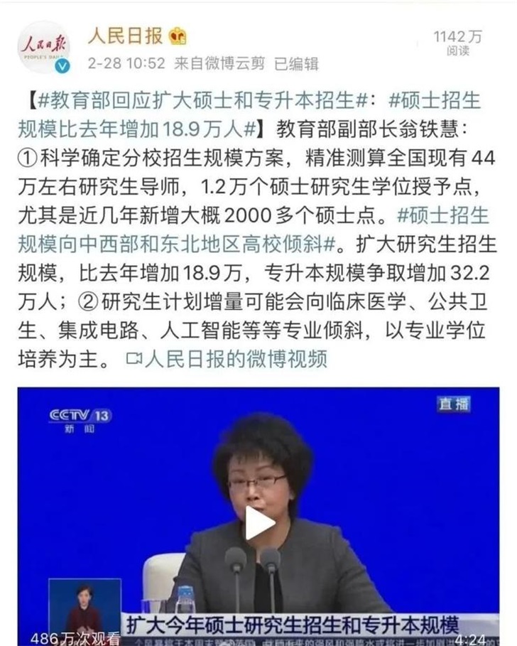 就在 2 月 28 日,國務(wù)院聯(lián)防聯(lián)控機(jī)制舉行新聞發(fā)布會(huì),教育部副部長翁鐵慧表示,今年將擴(kuò)大碩士研究生招生規(guī)模,預(yù)計(jì)同比增加 18.9 萬人。