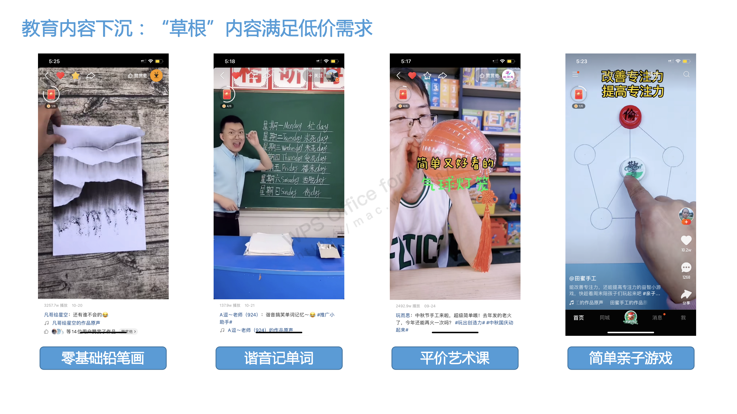 另外一點(diǎn)是,與學(xué)而思、猿題庫等“培優(yōu)”的教育定位全然不同,在短視頻平臺上,我們發(fā)現(xiàn)“差生”、“低價(jià)”的教育需求有大量未被滿足,快手平臺上諧音記單詞、零基礎(chǔ)樹葉畫畫等“草根”內(nèi)容吸引大量關(guān)注。