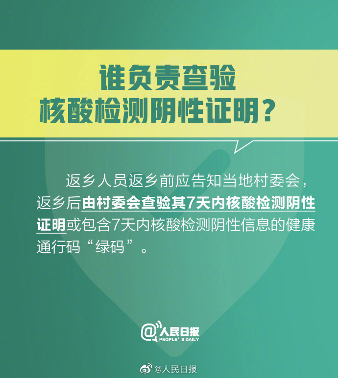 返鄉(xiāng)人員返鄉(xiāng)前應(yīng)告知當(dāng)?shù)卮逦瘯?huì),返鄉(xiāng)后由村委會(huì)查驗(yàn)其7天內(nèi)核酸檢測(cè)陰性證明或包含7天內(nèi)核酸檢測(cè)陰性信息的健康通行碼“綠碼”。