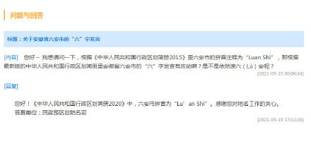 2021-05-20 10:37:34閱讀()民政部有網(wǎng)友近日在民政部網(wǎng)站咨詢關(guān)于安徽六安市的“六”字讀音問題:根據(jù)《中華人民共和國行政區(qū)劃簡冊2015》六安市的拼音為“Luan Shi”,那根據(jù)最新版“六”字發(fā)音有改動嘛?民政部區(qū)劃地名司回復(fù):《中華人民共和國行政區(qū)劃簡冊2020》中,六安市拼音為“Lu’an Shi”。 ?