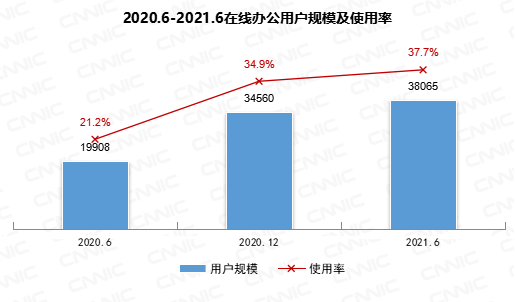 截至2021年6月,我國在線辦公用戶規(guī)模達(dá)3.81億,較2020年12月增長3506萬,占網(wǎng)民整體的37.7%。