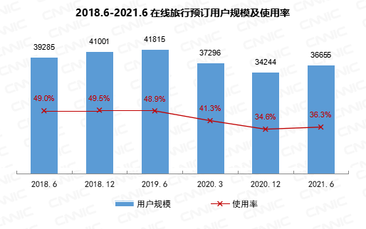 截至2021年6月,我國在線旅行預(yù)訂用戶規(guī)模達(dá)3.67億,較2020年12月增長2411萬,占網(wǎng)民整體的36.3%。