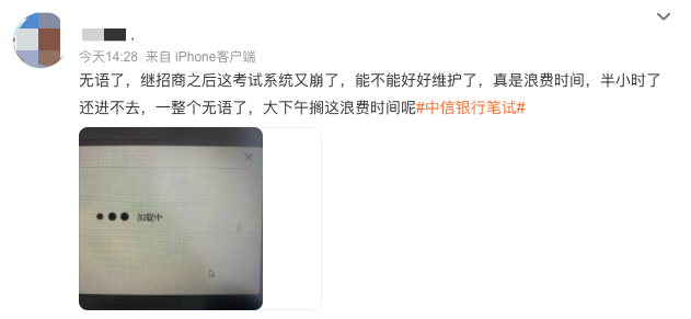 10月22日下午,大量網(wǎng)友在微博發(fā)文稱自己在參加中信銀行校招在線筆試時(shí)考試系統(tǒng)崩了。