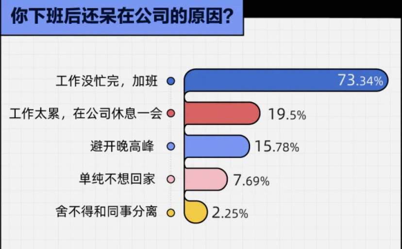 不過(guò)也有網(wǎng)友稱,自己曾經(jīng)都是活干完了到點(diǎn)就下班,但有同事曾私下跟他說(shuō)下班以后多在公司留半個(gè)小時(shí)一個(gè)小時(shí)再走,下班就走領(lǐng)導(dǎo)看見了不好。