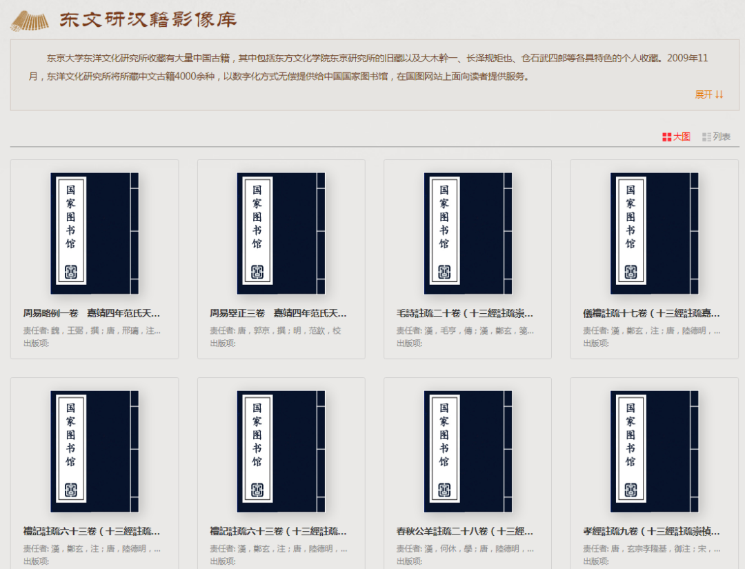 東京大學東洋文化研究所收藏有大量中國古籍,其中包括東方文化學院東京研究所的舊藏以及大木幹一、長澤規(guī)矩也、倉石武四郎等各具特色的個人收藏。2009 年 11 月,東洋文化研究所將所藏中文古籍近 4000 種,以數(shù)字化方式無償提供給中國國家圖書館,在國圖網站上面向讀者提供服務。