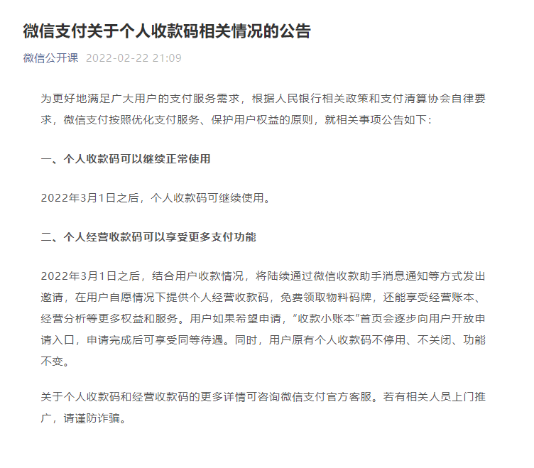 2022-02-23 15:40:46閱讀()互聯(lián)網(wǎng)2月22日消息,今天微信官方發(fā)布關(guān)于個(gè)人收款碼相關(guān)情況的公告,為更好地滿(mǎn)足廣大用戶(hù)的支付服務(wù)需求,根據(jù)人民銀行相關(guān)政策和支付清算協(xié)會(huì)自律要求,微信支付按照優(yōu)化支付服務(wù)、保護(hù)用戶(hù)權(quán)益的原則,就相關(guān)事項(xiàng)公告如下: