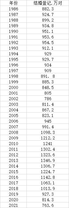 民政部最新發(fā)布的統(tǒng)計季報數(shù)據(jù)顯示,2021年我國結(jié)婚登記數(shù)據(jù)為763.6萬對。這是繼2019年跌破1000萬對、2020年跌破900萬對大關(guān)后,結(jié)婚登記數(shù)據(jù)再次跌破800萬對大關(guān)。根據(jù)數(shù)據(jù)發(fā)現(xiàn),這也創(chuàng)下了1986年(民政部網(wǎng)站公布有1986年以來的數(shù)據(jù))以來的新低,僅為2013年最高峰的56.6%。