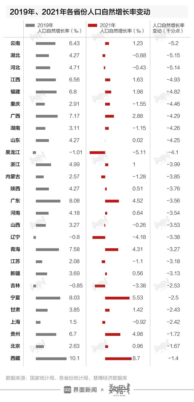 分各省份來看,據(jù)界面數(shù)據(jù)測算,在有人口自然增長率可查的27個(gè)省份中,以2019年數(shù)據(jù)為基準(zhǔn)線(2020年僅3個(gè)省份公布了人口自然率數(shù)據(jù)),2021年,人口自然增長率下降最大的3個(gè)省份是云南、湖北、河北,跌幅超5個(gè)千分點(diǎn)。