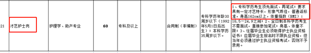 值得注意的是,該崗位在“其他條件”中要求:“??茖W歷考生須先面試、再筆試;要求具有一定才藝特長,形象氣質(zhì)佳,普通話標準,身高162cm以上,體重指數(shù)(BMI):18.5—24.9之間”,但“全日制本科學歷考生不需面試,直接參加筆試;身高、體重不限”;往屆生須具有護士執(zhí)業(yè)資格證書(或成績合格證),應屆生暫時不限執(zhí)業(yè)證書,但當年必須參加護士執(zhí)業(yè)資格考試并成績合格,否則不予錄用。”