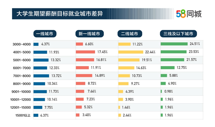 報(bào)告顯示,大學(xué)生平均期望月薪為7409元,企業(yè)對大學(xué)生平均支付月薪為7094元,大學(xué)生的收入水平基本符合預(yù)期構(gòu)想。大學(xué)生就業(yè)選擇的城市層級越高,薪酬期望也越高。首選在一線城市就業(yè)的大學(xué)生平均期望月薪為8151元,首選在新一線城市就業(yè)的大學(xué)生平均期望月薪為7394元,首選在二線城市就業(yè)的大學(xué)生平均期望月薪為6478元,首選在三線及以下城市就業(yè)的大學(xué)生平均期望月薪為5696元。