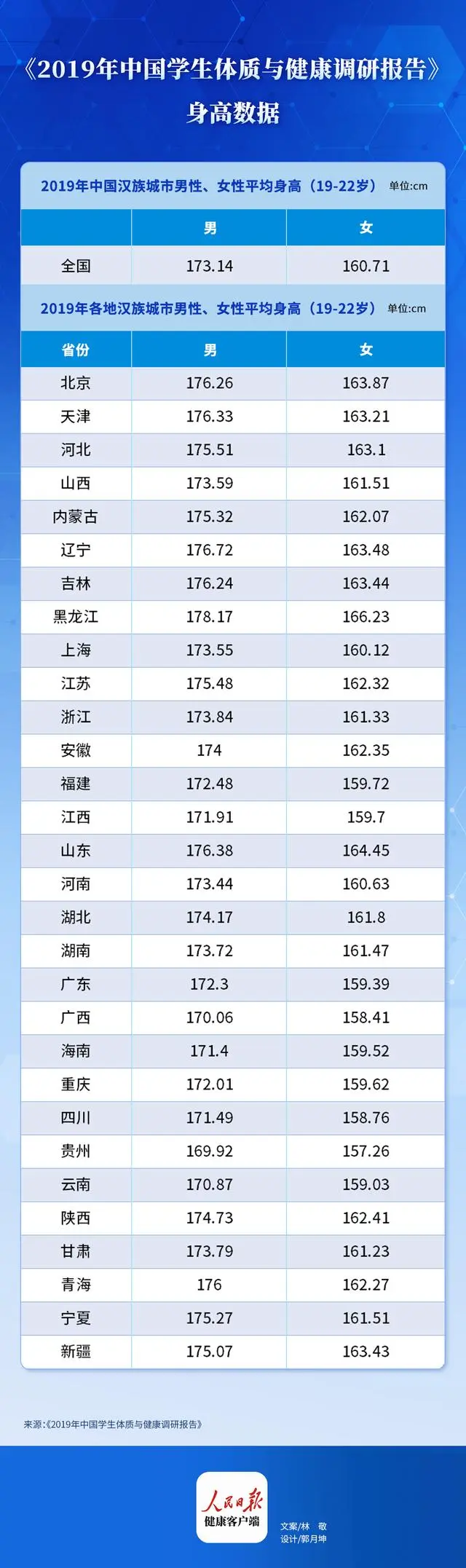 那么山東人的身高在全國中處于什么水平呢?人民日報(bào)健康客戶端查詢,根據(jù)高等教育出版社出版的《2019年中國學(xué)生體質(zhì)調(diào)研報(bào)告》,19-22歲我國城市男生平均身高173.99厘米,城市女生是161.41厘米。