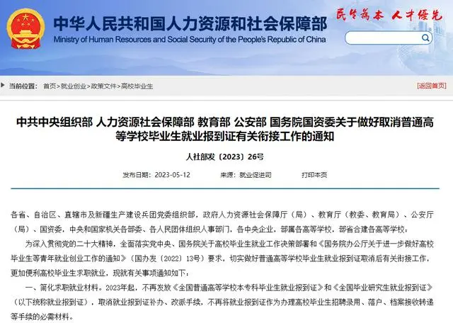 2023-05-13 09:47:19閱讀()人民政協(xié)網(wǎng)據(jù)人社部網(wǎng)站消息,日前中共中央組織部、人力資源社會保障部、教育部、公安部、國務(wù)院國資委發(fā)布《關(guān)于做好取消普通高等學(xué)校畢業(yè)生就業(yè)報到證有關(guān)銜接工作的通知》(以下簡稱《通知》)?!锻ㄖ访鞔_,2023年起,不再發(fā)放《全國普通高等學(xué)校本專科畢業(yè)生就業(yè)報到證》和《全國畢業(yè)研究生就業(yè)報到證》(以下統(tǒng)稱“就業(yè)報到證”),取消就業(yè)報到證補辦、改派手續(xù),不再將就業(yè)報到證作為辦理高校畢業(yè)生招聘錄用、落戶、檔案接收轉(zhuǎn)遞等手續(xù)的必需材料。