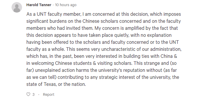 其中,一名直接參與了該校中國(guó)公派學(xué)生學(xué)者項(xiàng)目的教授,就在上述求助帖中留言,表示學(xué)校對(duì)這些中國(guó)留學(xué)生和學(xué)者的做法“是不公平的”,而且也是“毫無(wú)必要”的,因?yàn)樗麤]聽說(shuō)過北得克薩斯州大學(xué)的任何中國(guó)公派留學(xué)生和學(xué)者中,有人遭到任何具體的指控。所以他無(wú)法理解為何學(xué)校要一下子就把所有中國(guó)公派留學(xué)生和學(xué)者全都趕走。