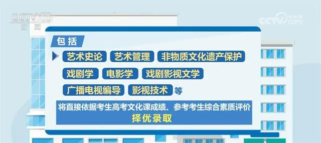 據(jù)了解,藝術(shù)類專業(yè)依據(jù)考生高考文化成績、專業(yè)考試成績,參考綜合素質(zhì)評價進行招生錄取。此次藝考改革一個重要的變化是,部分藝術(shù)類專業(yè)不再組織專業(yè)考試,包括藝術(shù)史論、藝術(shù)管理、非物質(zhì)文化遺產(chǎn)保護、戲劇學(xué)、電影學(xué)、戲劇影視文學(xué)、廣播電視編導(dǎo)、影視技術(shù)等,將直接依據(jù)考生高考文化課成績、參考考生綜合素質(zhì)評價,擇優(yōu)錄取。