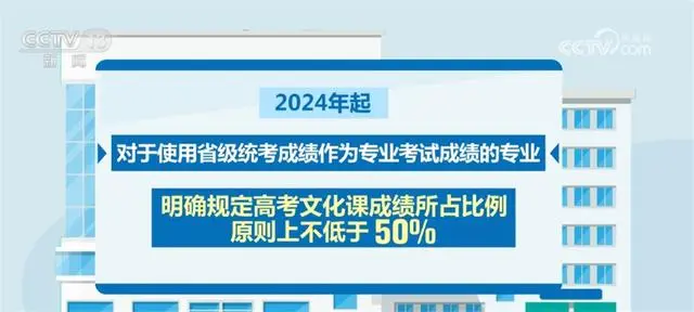 此外,2024年起,對于使用省級統(tǒng)考成績作為專業(yè)考試成績的專業(yè),明確規(guī)定高考文化課成績所占比例原則上不低于50%。同時,鼓勵??几咝=Y(jié)合專業(yè)培養(yǎng)要求,進一步提高考生高考文化課成績錄取要求。