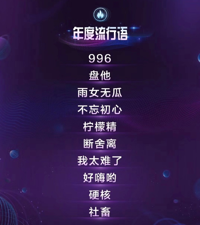 百度沸點(diǎn)公布了2019年度十大中文搜索流行語,996、盤他、雨女無瓜、不忘初心、檸檬精、斷舍離、我太難了、好嗨呦、硬核、社畜上榜。其結(jié)果 ...