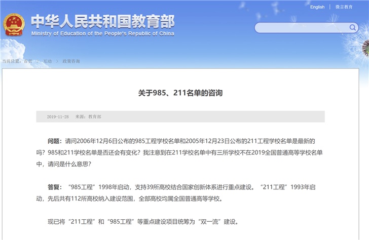 近期中國教育部網(wǎng)站做出了關(guān)于985、211名單的咨詢,解答中表示,現(xiàn)已將211工程和985工程等重點(diǎn)建設(shè)項(xiàng)目統(tǒng)籌為雙一流建設(shè)。關(guān)于985、211名單 ...