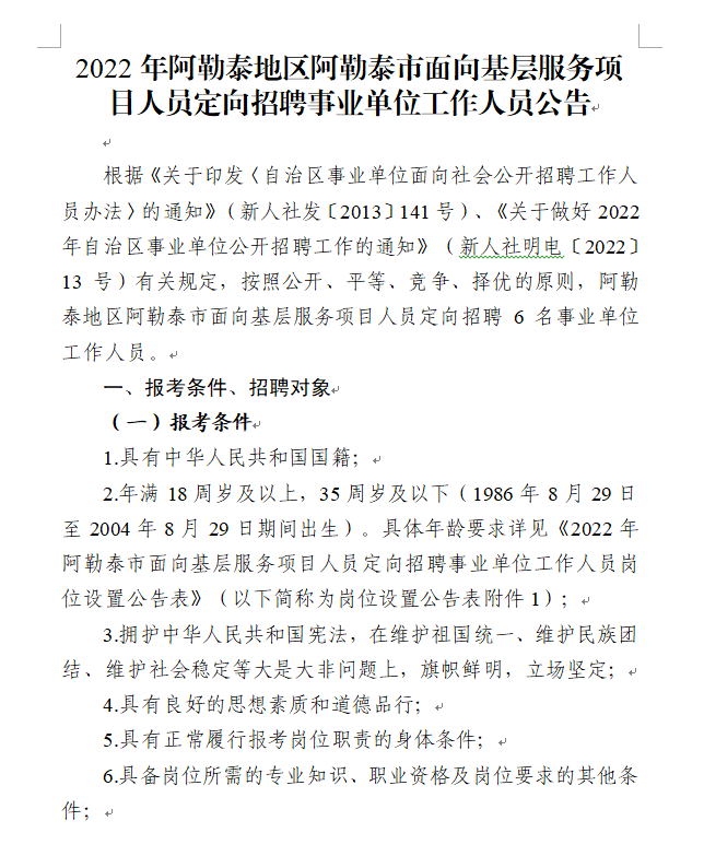 2022年阿勒泰地區(qū)阿勒泰市面向基層服務(wù)項(xiàng)目人員定向招聘事業(yè)單位工作人員公告