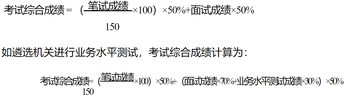 面試結(jié)束后,各遴選、選調(diào)機關(guān)及時公布考試綜合成績??荚嚲C合成績由筆試和面試成績組成,總分為100分,其中,筆試、面試成績各占50%。如進(jìn)行業(yè)務(wù)水平測試的,業(yè)務(wù)水平測試成績占面試成績的30%。根據(jù)總成績排名從高到低,按照規(guī)定比例確定考察和體檢人選。具體計算公式如下: