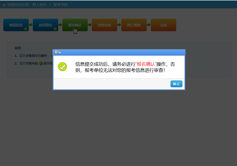 報(bào)考人員報(bào)名信息提交后,請(qǐng)務(wù)必進(jìn)行“報(bào)名確認(rèn)”操作,否則,報(bào)考單位無法進(jìn)行資格審查。