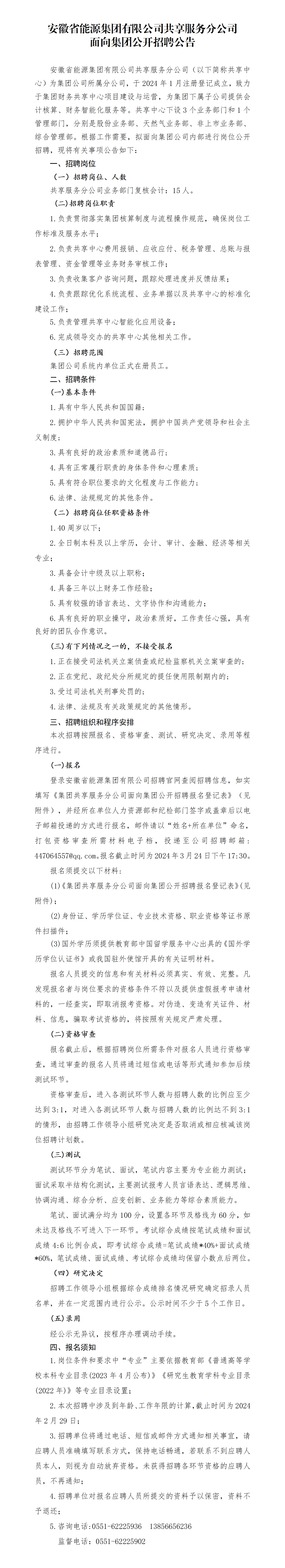 2024年安徽省能源集團有限公司共享服務分公司面向集團公開招聘公告