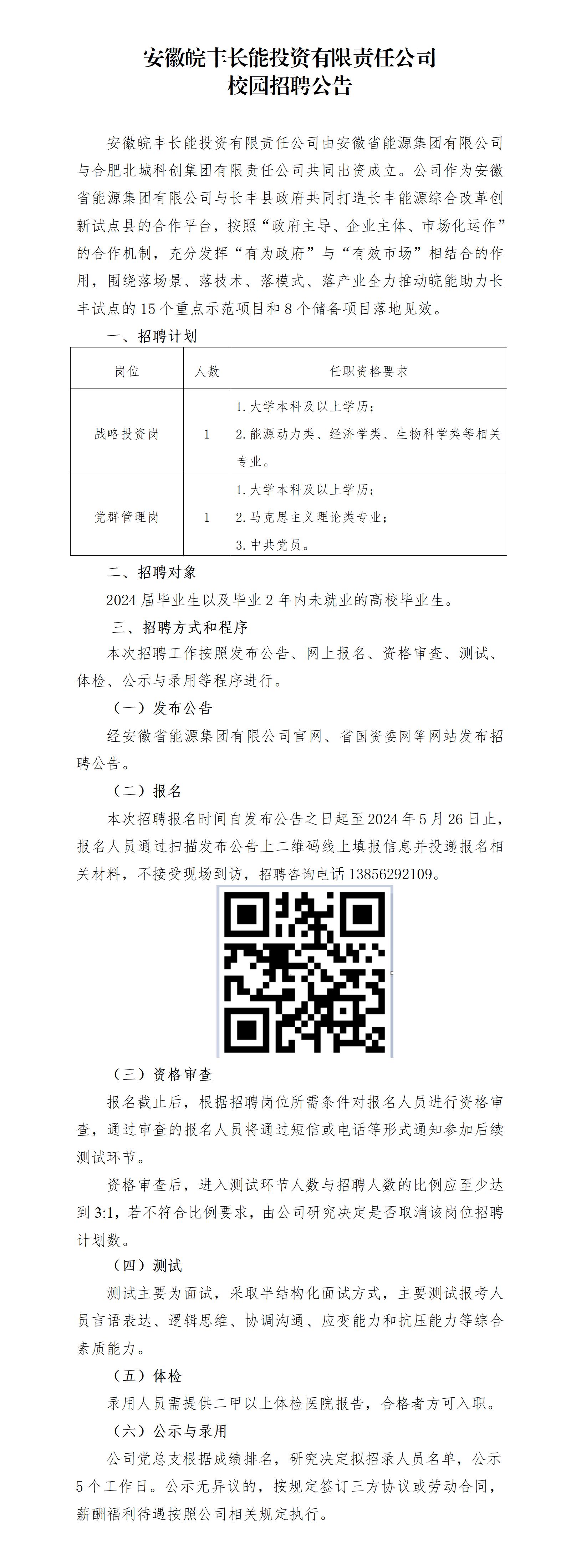2024年安徽皖豐長(zhǎng)能投資有限責(zé)任公司校園招聘公告