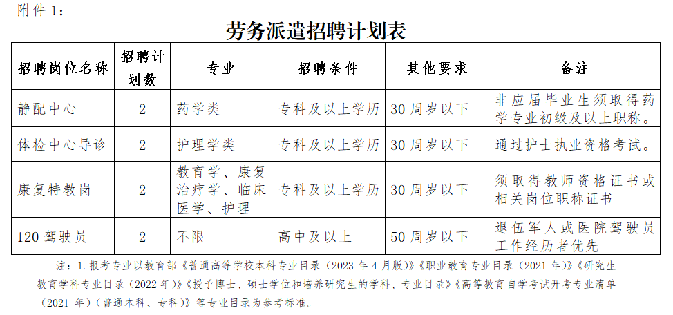 具體招聘崗位及人數(shù)詳見附件1:勞務(wù)派遣招聘計(jì)劃表