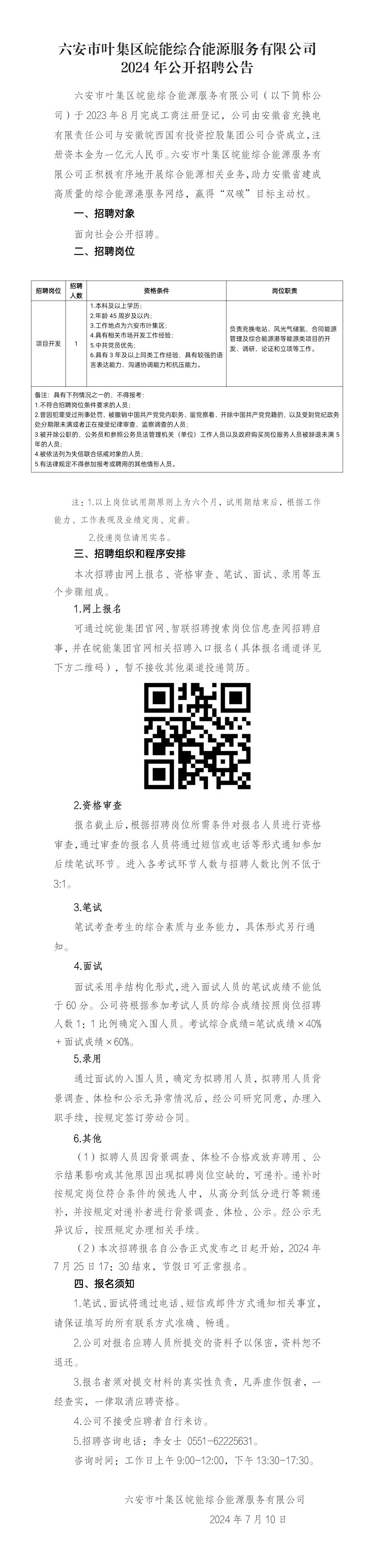 2024年六安市葉集區(qū)皖能綜合能源服務有限公司公開招聘公告