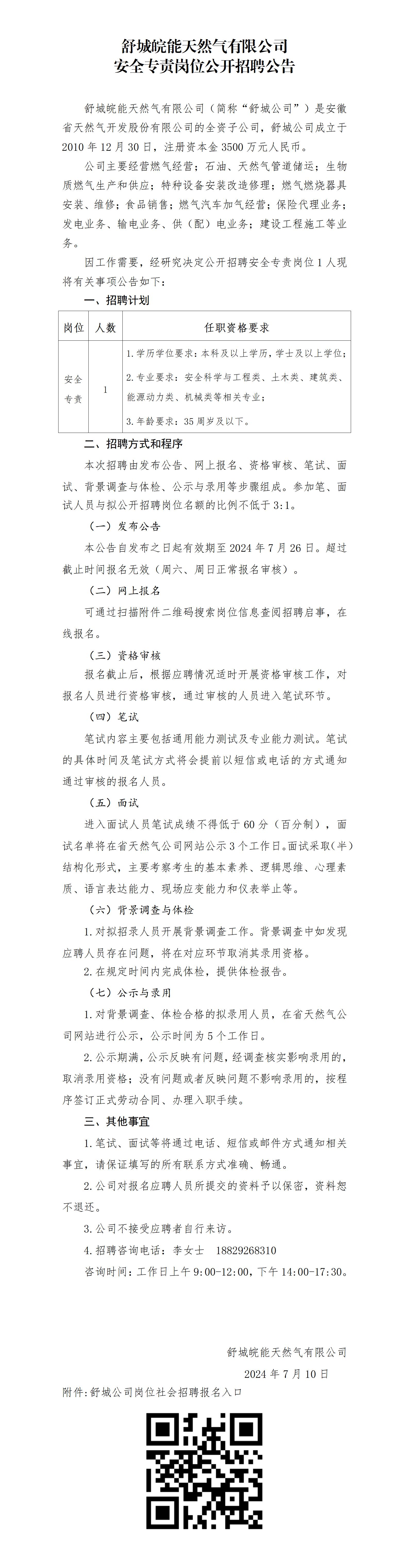 2024年六安舒城皖能天然氣有限公司安全專責(zé)崗位公開招聘公告
