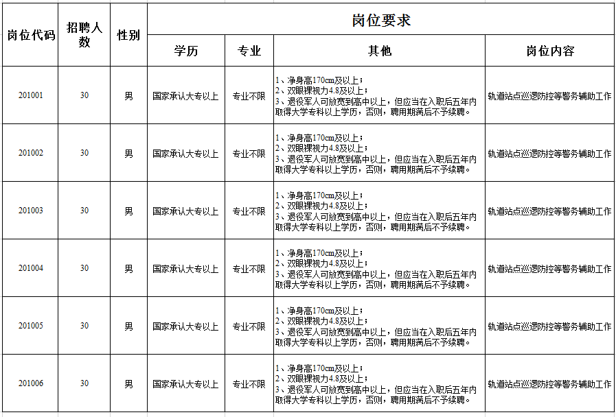 4.雙眼裸視力達(dá)到4.8及以上,五官、體型端正、具有正常履行職責(zé)的身體條件,無(wú)明顯生理缺陷及特征、傳染性疾病、殘疾、口吃、重聽(tīng)、色盲(弱)、紋身;