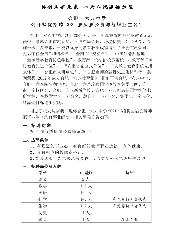 根據(jù)學校發(fā)展需要,現(xiàn)將合肥一六八中學2021年招聘應屆公費師范畢業(yè)生(均有事業(yè)編制)相關事項公告如下: