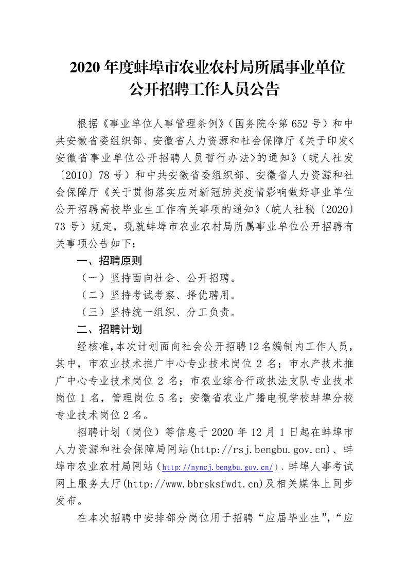 2020-12-01 23:37:34閱讀()蚌埠市人力資源和社會(huì)保障局根據(jù)《事業(yè)單位人事管理?xiàng)l例》(國(guó)務(wù)院令第652號(hào))和中共安徽省委組織部、安徽省人力資源和社會(huì)保障廳《關(guān)于印發(fā)<安徽省事業(yè)單位公開(kāi)招聘人員暫行辦法>的通知》(皖人社發(fā)〔2010〕78號(hào))和中共安徽省委組織部、安徽省人力資源和社會(huì)保障廳《關(guān)于貫徹落實(shí)應(yīng)對(duì)新冠肺炎疫情影響做好事業(yè)單位公開(kāi)招聘高校畢業(yè)生工作有關(guān)事項(xiàng)的通知》(皖人社秘〔2020〕73號(hào))規(guī)定,現(xiàn)就蚌埠市農(nóng)業(yè)農(nóng)村局所屬事業(yè)單位公開(kāi)招聘有關(guān)事項(xiàng)公告如下: