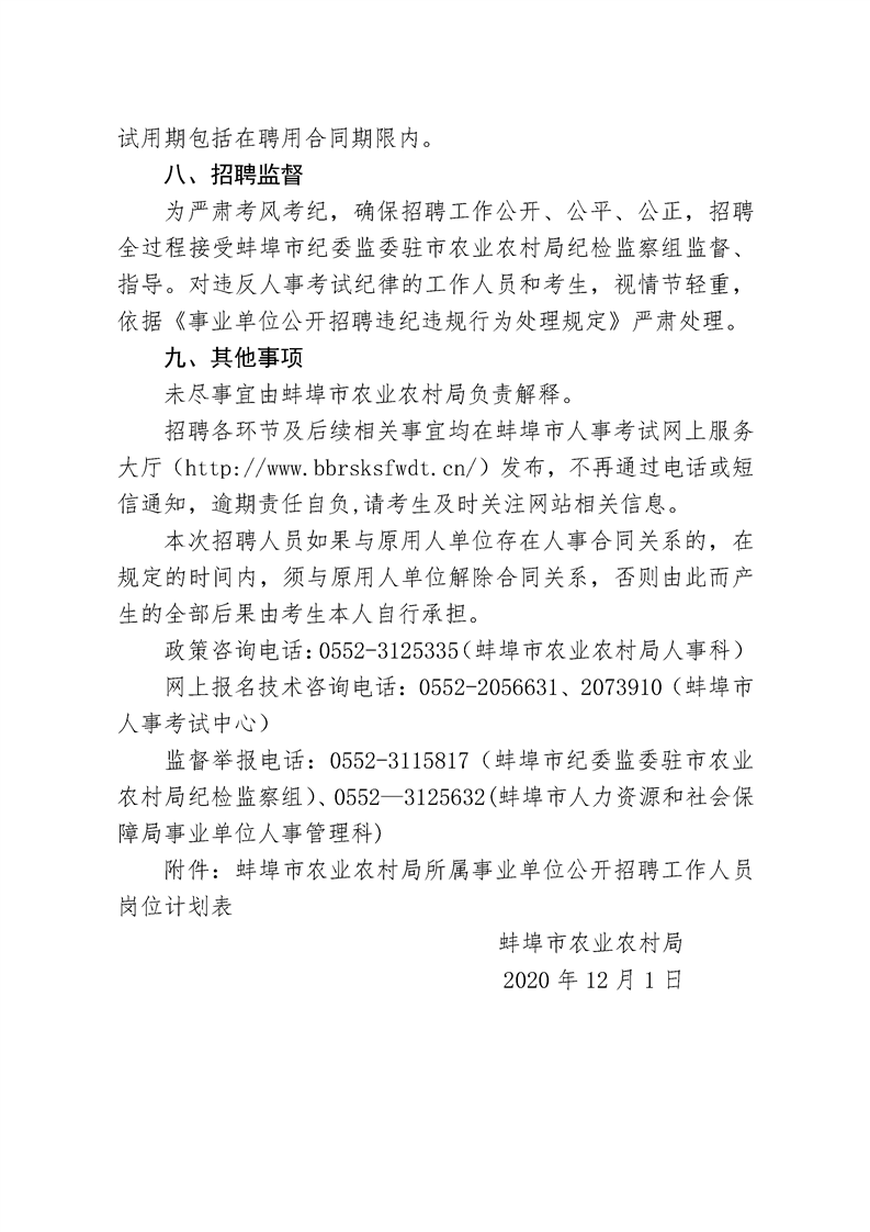 監(jiān)督舉報(bào)電話:0552-3115817(蚌埠市紀(jì)委監(jiān)委駐市農(nóng)業(yè)農(nóng)村局紀(jì)檢監(jiān)察組)、0552—3125632(蚌埠市人力資源和社會(huì)保障局事業(yè)單位人事管理科)