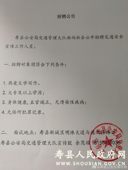 原標(biāo)題:2020年壽縣公安局交通管理大隊(duì)招聘交通安全宣傳工作人員公告