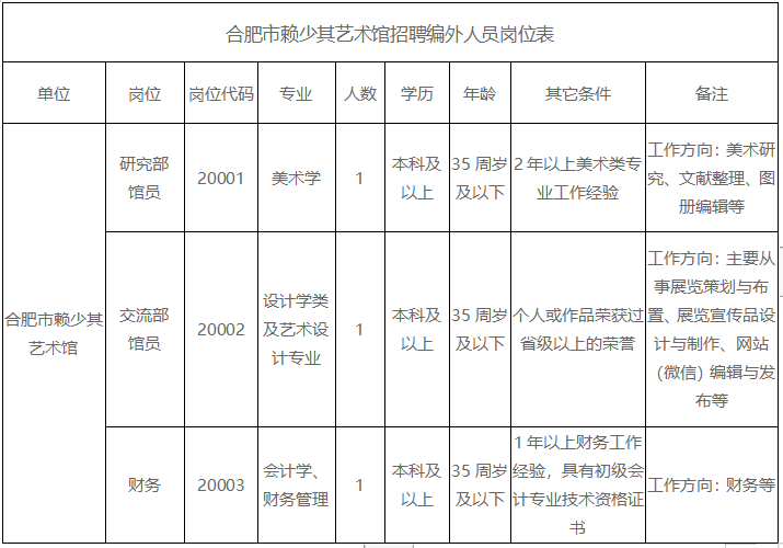 合肥市賴少其藝術(shù)館是合肥市委、市政府為建設(shè)文化強市,提高文化品位,收藏曾菲女士捐贈的賴少其300件書畫珍品和寶貴史料,展示和弘揚賴少其藝術(shù),投資新建的公益性文化設(shè)施,于2005年12月22日落成并對外免費開放,隸屬于合肥市文化和旅游局。作為合肥市公益性文化事業(yè)單位和合肥市對外文化窗口,藝術(shù)館至今已13次入選文化和旅游部各類重點項目,其中連續(xù)7次入選“文化和旅游部全國美術(shù)館館藏精品展出季”項目,連續(xù)2次入選“文化和旅游部內(nèi)地與港澳文化交流重點項目”,4次榮獲文化部獎項。因工作需要,合肥市賴少其藝術(shù)館面向社會公開招聘3名工作人員。具體如下: