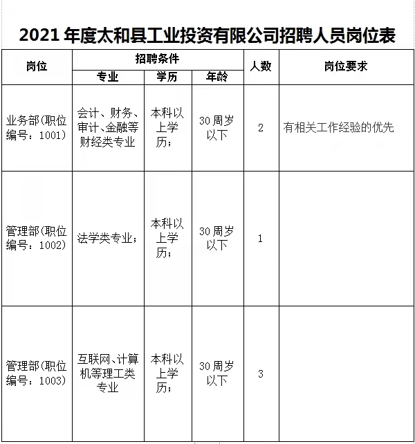 太和縣工業(yè)投資有限公司是經(jīng)太和縣人民政府批準(zhǔn),由太和縣國有資產(chǎn)管理局單獨(dú)出資設(shè)立的一家國有獨(dú)資公司。公司主營工業(yè)項(xiàng)目投資、助保金貸款、資產(chǎn)運(yùn)營、工業(yè)項(xiàng)目信息咨詢服務(wù)、基礎(chǔ)設(shè)施建設(shè)、棚戶區(qū)改造、農(nóng)村路網(wǎng)建設(shè)、農(nóng)業(yè)技術(shù)開發(fā)、污水處理等。現(xiàn)根據(jù)公司業(yè)務(wù)發(fā)展需要,擬面向社會(huì)公開招聘6名工作人員,具體公告如下: