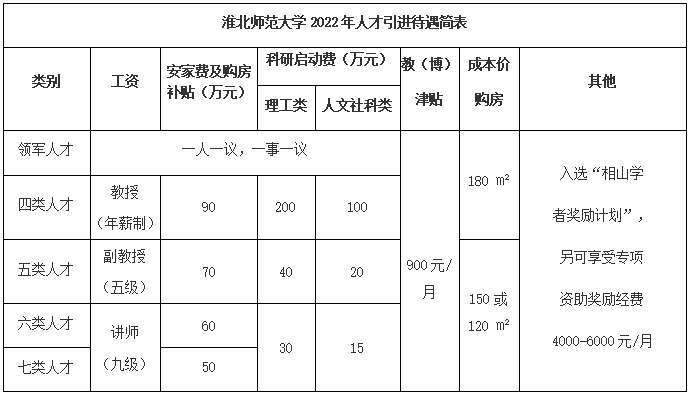 2. 四類至七類人才:引進(jìn)的四類至七類人才享受《淮北師范大學(xué)人才引進(jìn)待遇簡表》中相應(yīng)的安家費(fèi)及購房補(bǔ)貼、科研啟動(dòng)費(fèi)、教授(博士)津貼、成本價(jià)購房等待遇;其配偶具有學(xué)士及以上學(xué)位,可在校內(nèi)安排工作。同時(shí),聘期(6年)內(nèi)入選“相山學(xué)者獎(jiǎng)勵(lì)計(jì)劃”,另可享受專項(xiàng)資助獎(jiǎng)勵(lì)經(jīng)費(fèi)4000-6000元/月。引進(jìn)人才的具體聘期任務(wù)及待遇以雙方合同約定為準(zhǔn)(教育部重點(diǎn)實(shí)驗(yàn)室聘用人才的待遇另行約定)。