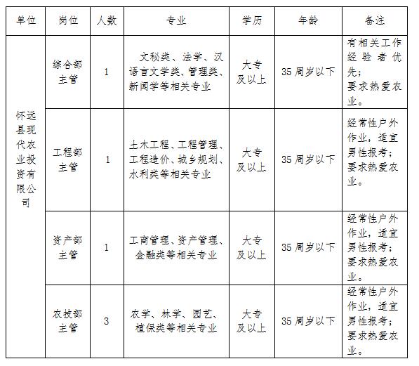 2020-06-19 22:53:01閱讀()懷遠(yuǎn)縣人民政府懷遠(yuǎn)縣現(xiàn)代農(nóng)業(yè)投資有限公司隸屬于懷遠(yuǎn)現(xiàn)代農(nóng)業(yè)綜合開發(fā)示范區(qū),是懷遠(yuǎn)縣政府出資設(shè)立的國有獨資公司。隨著公司業(yè)務(wù)的發(fā)展,公司現(xiàn)有人員已經(jīng)無法滿足日常工作需求,為了更廣泛地選拔優(yōu)秀人才,擬面向社會公開招聘6名公司工作人員,具體招聘方案如下:
