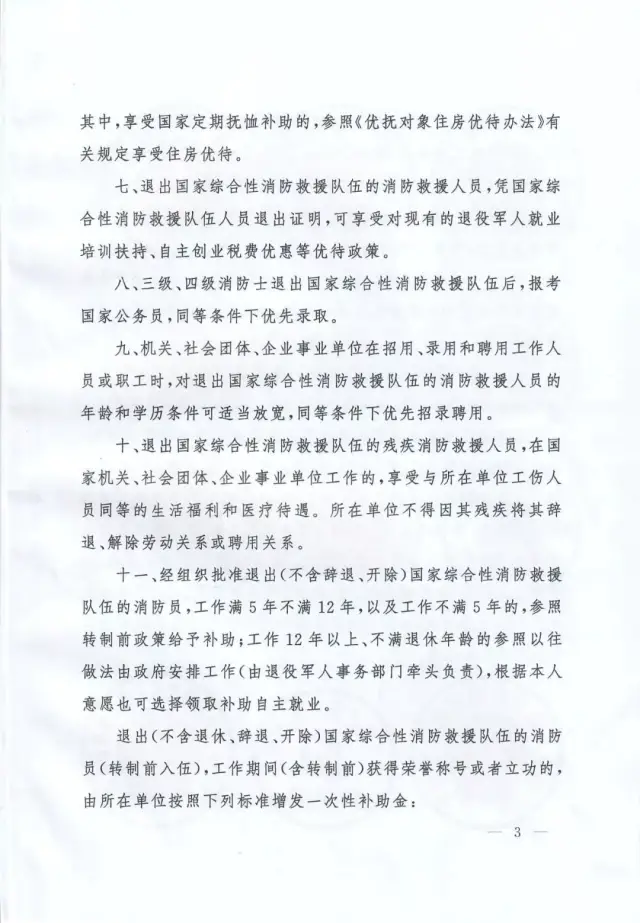 國家發(fā)展改革委員會、教育部、財政部、人力資源社會保障部、交通運輸部、退役軍人事務部等部委與應急管理部聯(lián)合出臺的《關于做好國家綜合性消防救援隊伍人員有關優(yōu)待工作的通知》(應急〔2019〕84號)、《關于保障國家綜合性消防救援隊伍人員交通出行優(yōu)待權益有關事項的通知》(交運規(guī)〔2019〕4號)等文件,明確國家綜合性消防救援隊伍人員在傷亡撫恤、退出安置、就業(yè)創(chuàng)業(yè)、家庭優(yōu)待、子女入學、住房醫(yī)療、交通出行、參觀游覽等方面享受專門優(yōu)待政策。