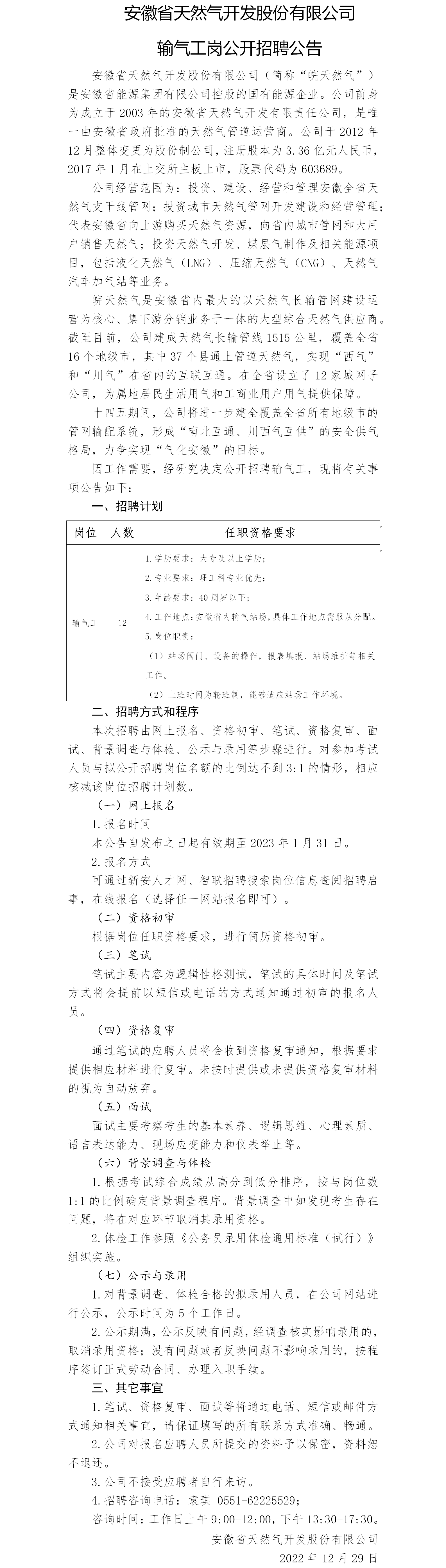 2023年安徽省天然氣開發(fā)股份有限公司輸氣工崗公開招聘公告