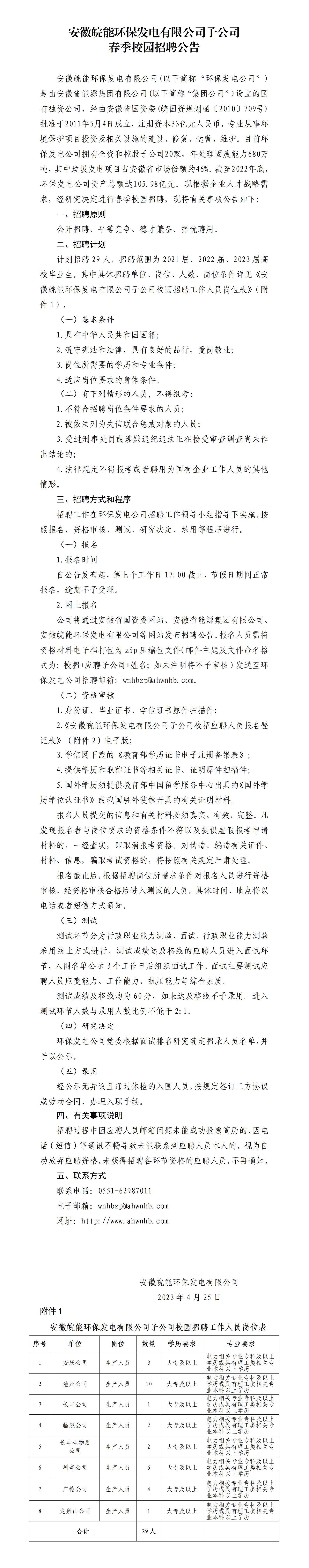 計劃招聘29人,招聘范圍為2021屆、2022屆、2023屆高校畢業(yè)生。其中具體招聘單位、崗位、人數(shù)、崗位條件詳見《安徽皖能環(huán)保發(fā)電有限公司子公司校園招聘工作人員崗位表》(附件1)。